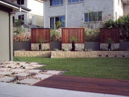 Slate stack (also known as stack stone) and Merbau screens were constructed as a major focal point of this backyard landscape renovation. Native grass trees were planted in front of each feature panel. Mini spot lights on the grass trees shadowed their image nightly against the feature screens. Merbau timber decking extended out from a tiled alfresco area and was complimented by a paved stepper area in a decorative gravel finish.